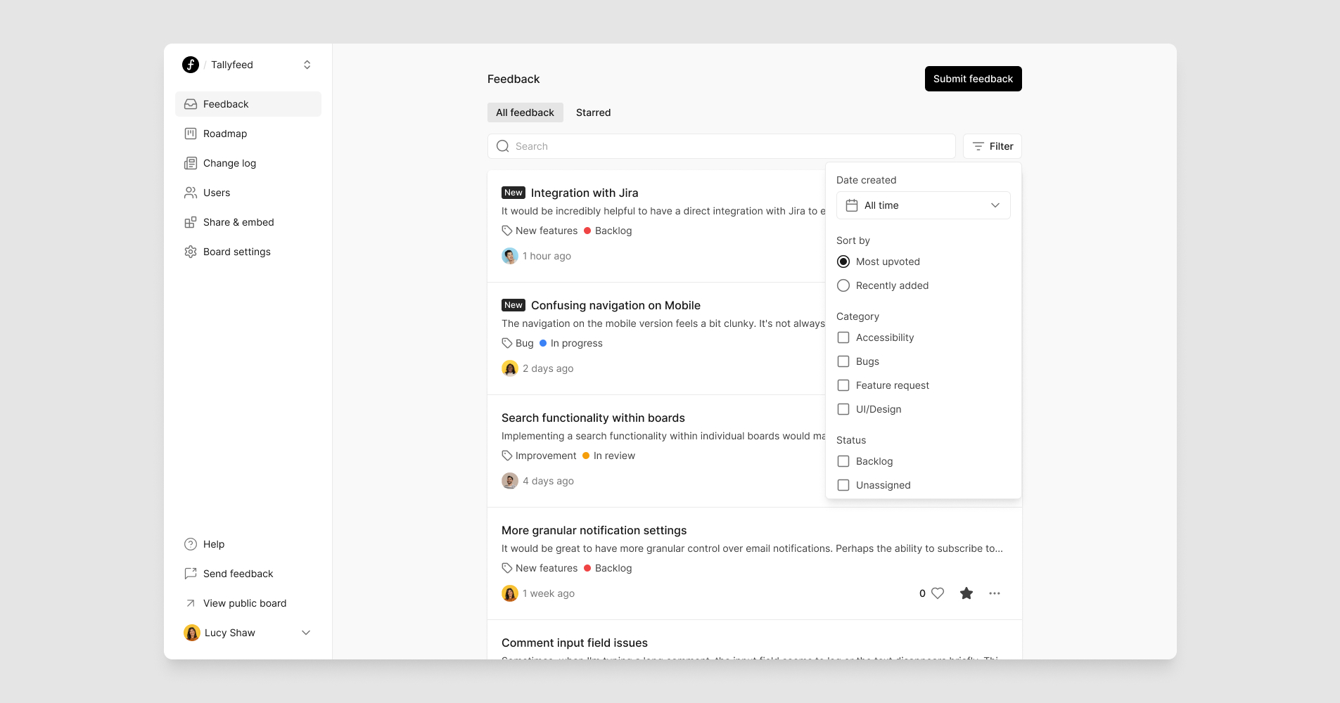 Product development thrives on customer insights, but gathering and acting on scattered feedback often feels chaotic, leading to guesswork and missed opportunities. Tallyfeed solves this by providing a dedicated, intuitive platform for product owners to centralize, organize, and understand user feedback. By transforming raw feedback into a clear, actionable roadmap, Tallyfeed empowers you to make confident, data-driven decisions. Close the loop effectively with integrated roadmaps and changelogs, showing your customers their impact and building products they truly love. Start building smarter, faster, and with absolute clarity.