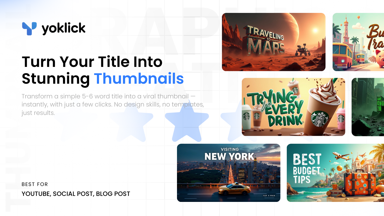 yoklick is the fastest way to create scroll-stopping YouTube thumbnails from just a few words. No design skills, no templates — just type a 5-6 word prompt and get AI-generated thumbnails instantly. Whether you're a solo creator, agency, or brand, Yoklick helps you save hours and boost click-through rates with thumbnails that actually perform. Customize styles, preview in real time, and download in one click. Ideal for content creators who want to go from idea to thumbnail in seconds.