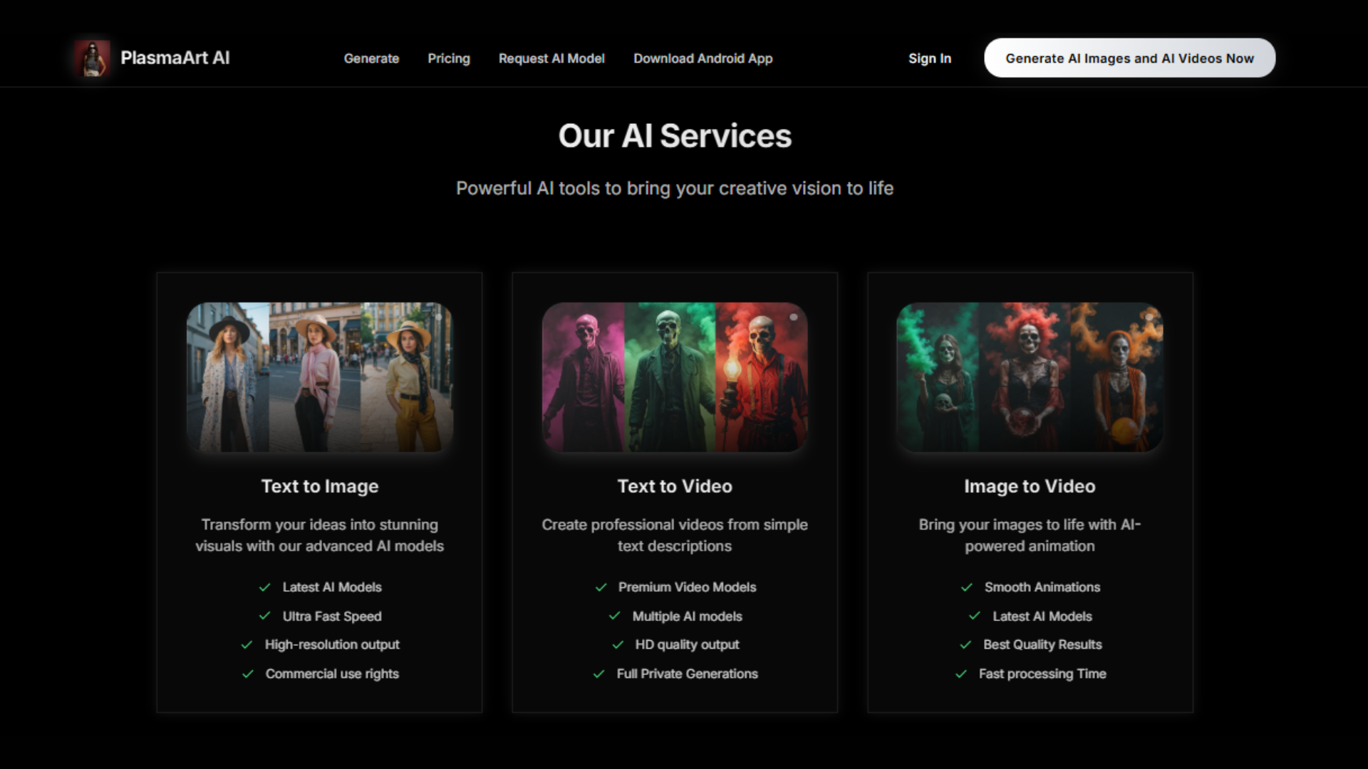 PlasmaArt AI, an advanced AI-powered creative generation platform designed to bring your imagination to life through cutting-edge image and video generation technologies. At PlasmaArt AI, we empower creators, designers, storytellers, developers, and brands with seamless access to world-class AI models. Our platform supports high-performance Text-to-Image, Text-to-Video, and Image-to-Video services, ensuring an end-to-end visual content creation experience