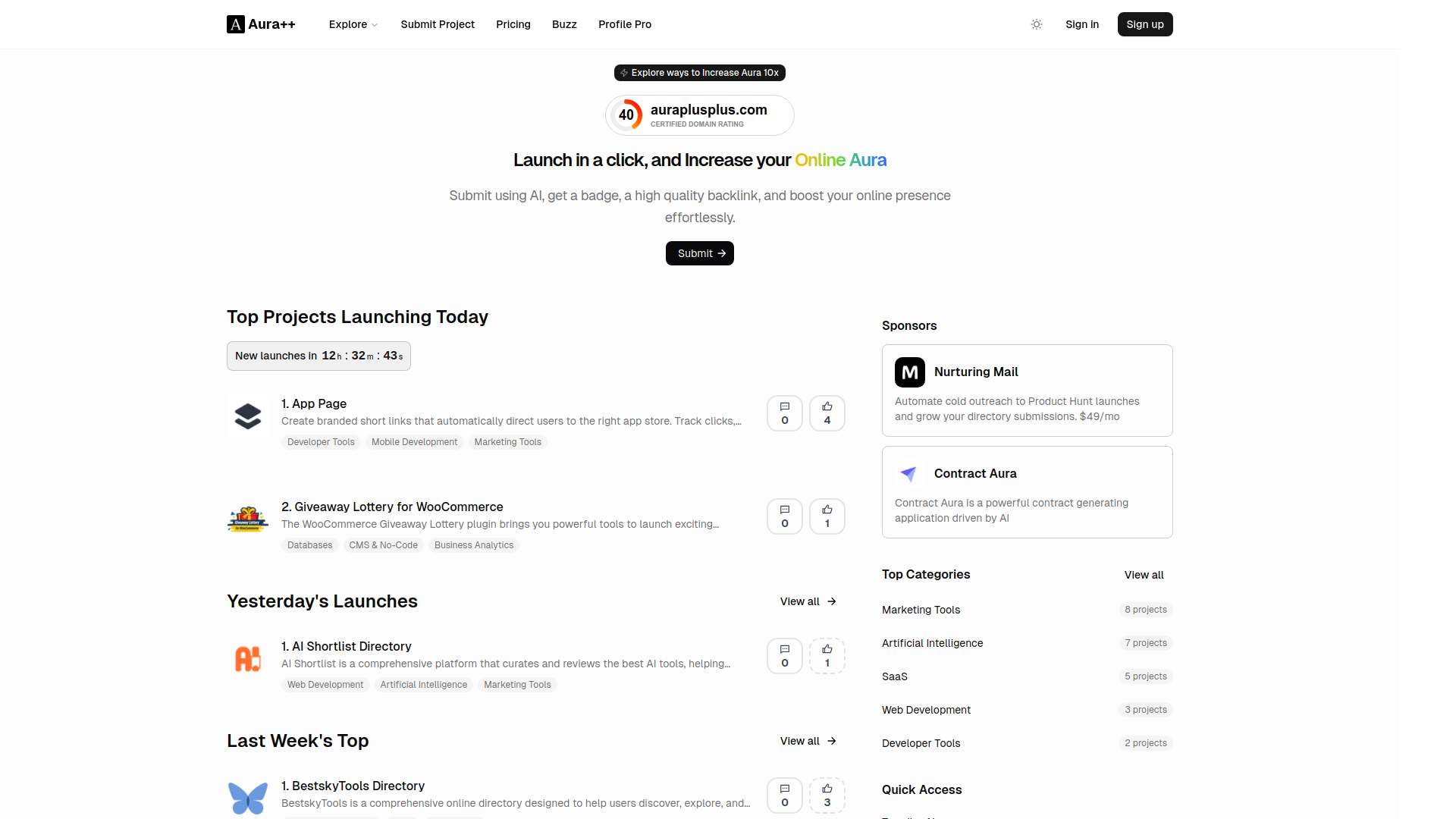 Aura++ is an AI-powered platform designed to help startups and creators launch their products with a single click. Submit effortlessly, earn a credibility badge and increase your online aura. Explore ways to Increase Aura 10x. Launch in a click, and Increase your Online Aura. Submit using AI, get a badge, a high quality backlink, and boost your online presence effortlessly.
