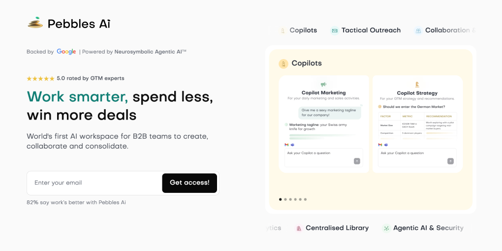 World's first AI workspace for B2B teams to create, collaborate and consolidate. 1. Create effective marketing strategies, targeted outreach campaigns, impactful marketing & sales content 2. Collaborate across teams and functions on day-to-day projects to shape business strategy 3. Consolidate the company’s knowledge base, your marketing and sales teams, your existing tech stack