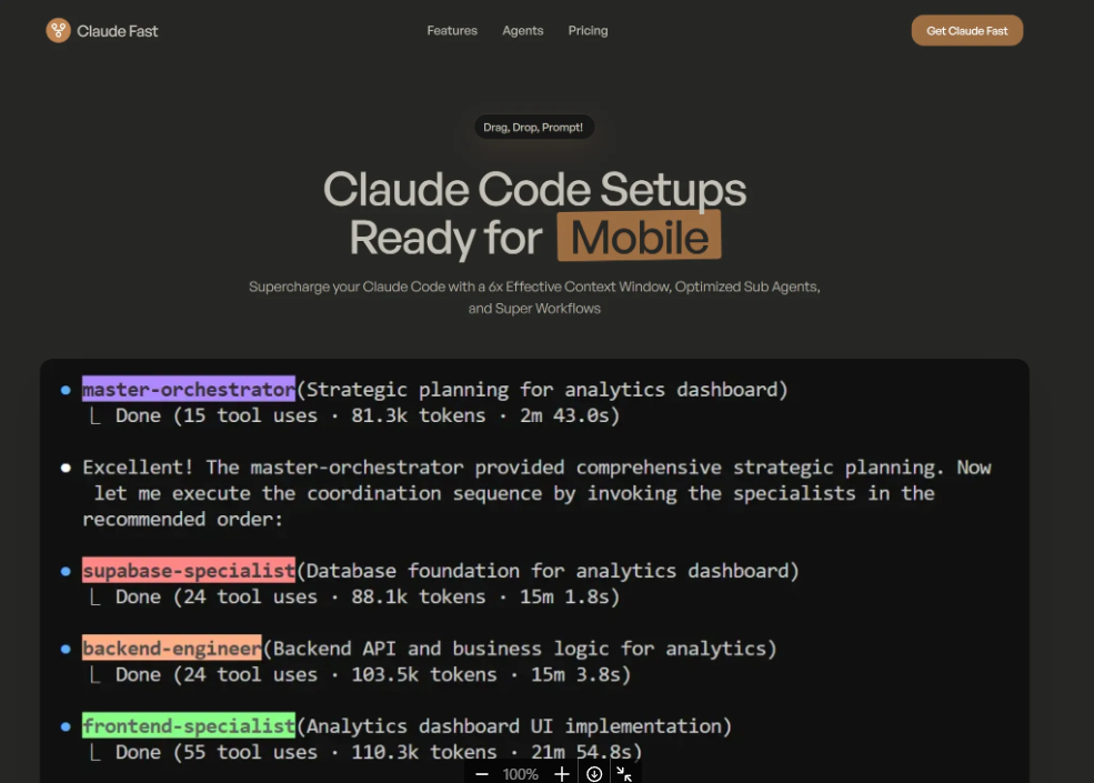 ClaudeFast is a premade, optimized Claude Code configuration featuring 11 orchestrated AI specialists with the first-ever Claude Code native task management sync — enabling a 6x effective context window (1M+ tokens).