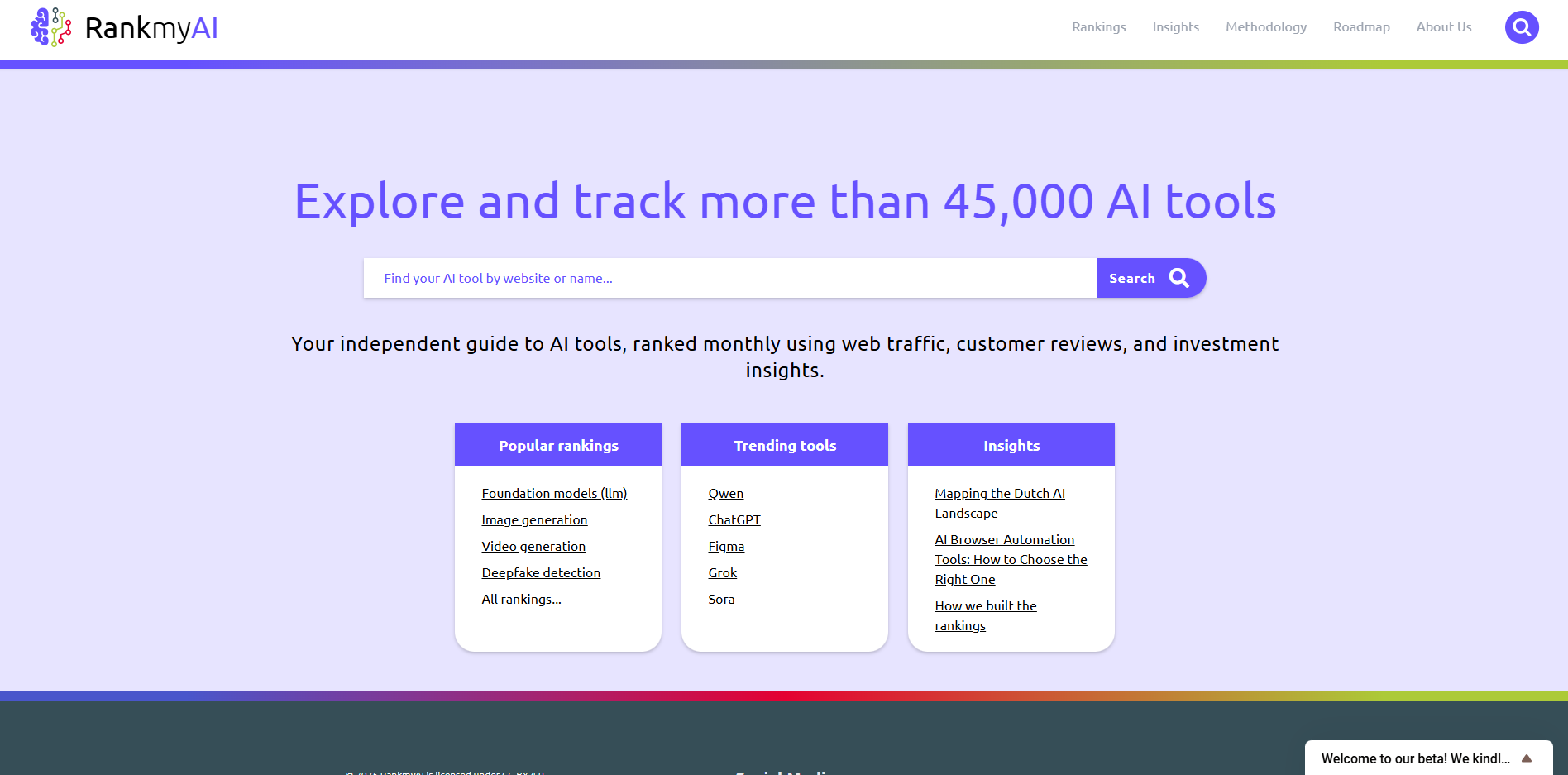RankmyAI is your independent guide to AI tools, ranked monthly using web traffic, customer reviews, and investment insights. Explore and track more than 45,000 AI tools with transparent, data-driven rankings.