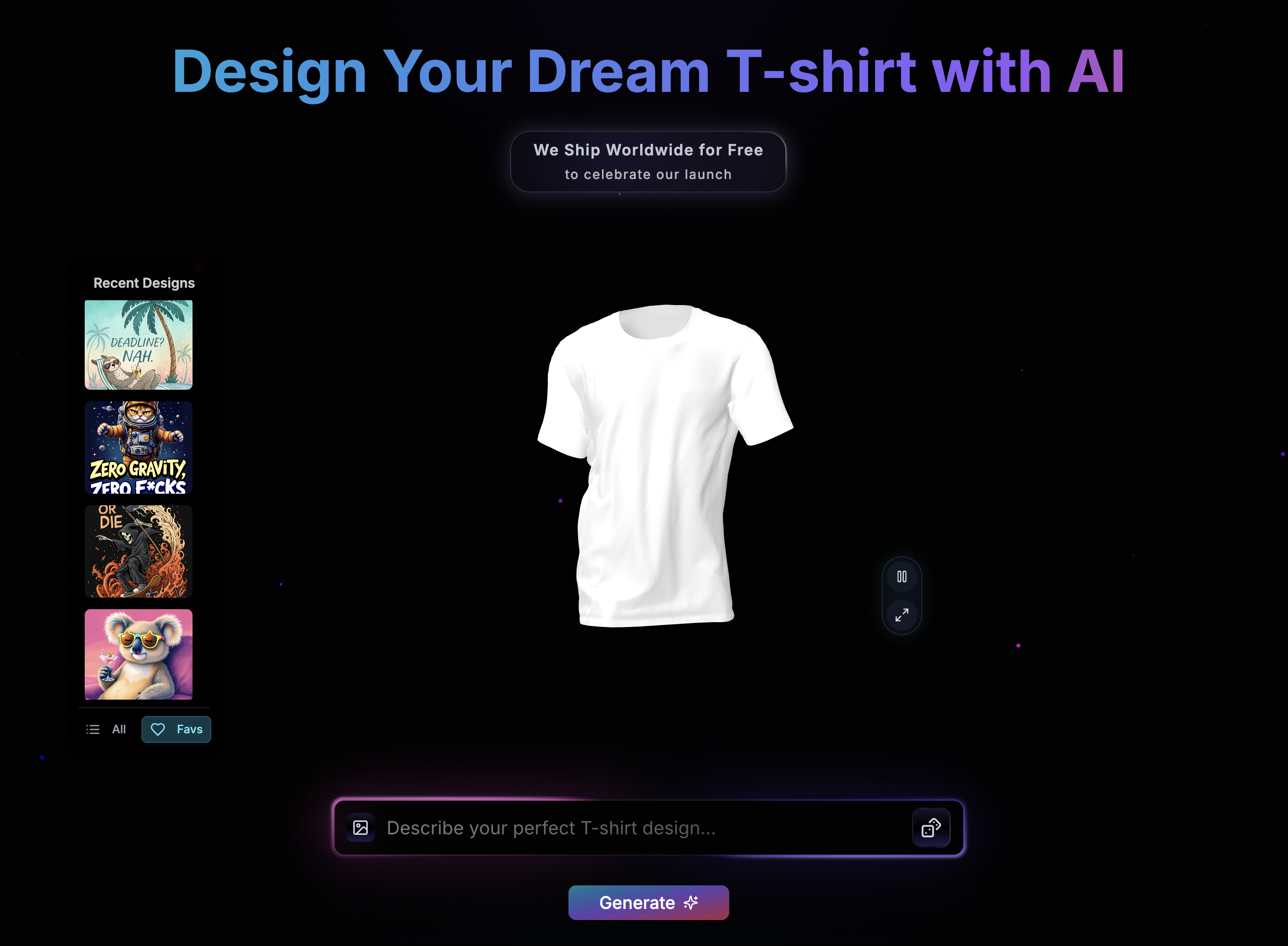 Turn prompts into wearables. Write your idea, spin it in 3D, tweak it, and we’ll print it edge to edge, front, back, and sleeves. Full-print tees, made to order. You prompt it, we ship it. Why it’s different • Full-print coverage (not just a small chest logo) • Instant 3D preview you can spin and zoom • AI editing to refine every detail • 3D-aware generation that understands global aesthetics • We print every pixel and ship it to you From idea to garment in minutes. You can now wear your