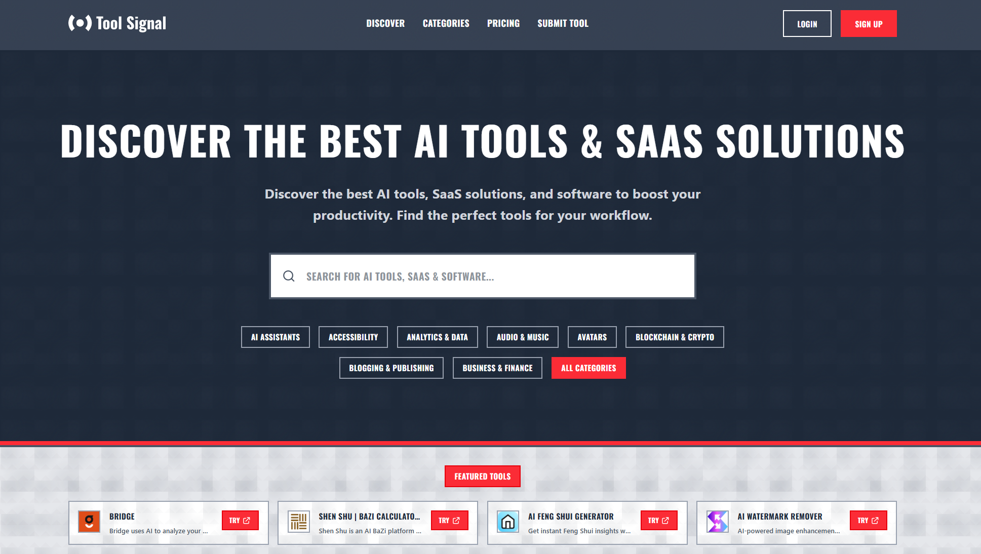 Tool Signal is your signal in the noise—an all-in-one directory to discover the best AI tools, SaaS platforms, and productivity software for your workflow. Whether you're an entrepreneur, marketer, developer, or creative, Tool Signal helps you cut through the clutter and find exactly what you need—fast.