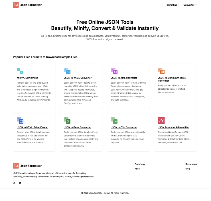 All-in-one JSON toolbox for developers and data analysts. Quickly format, compress, validate, and convert JSON files. 100% free and no signup required.