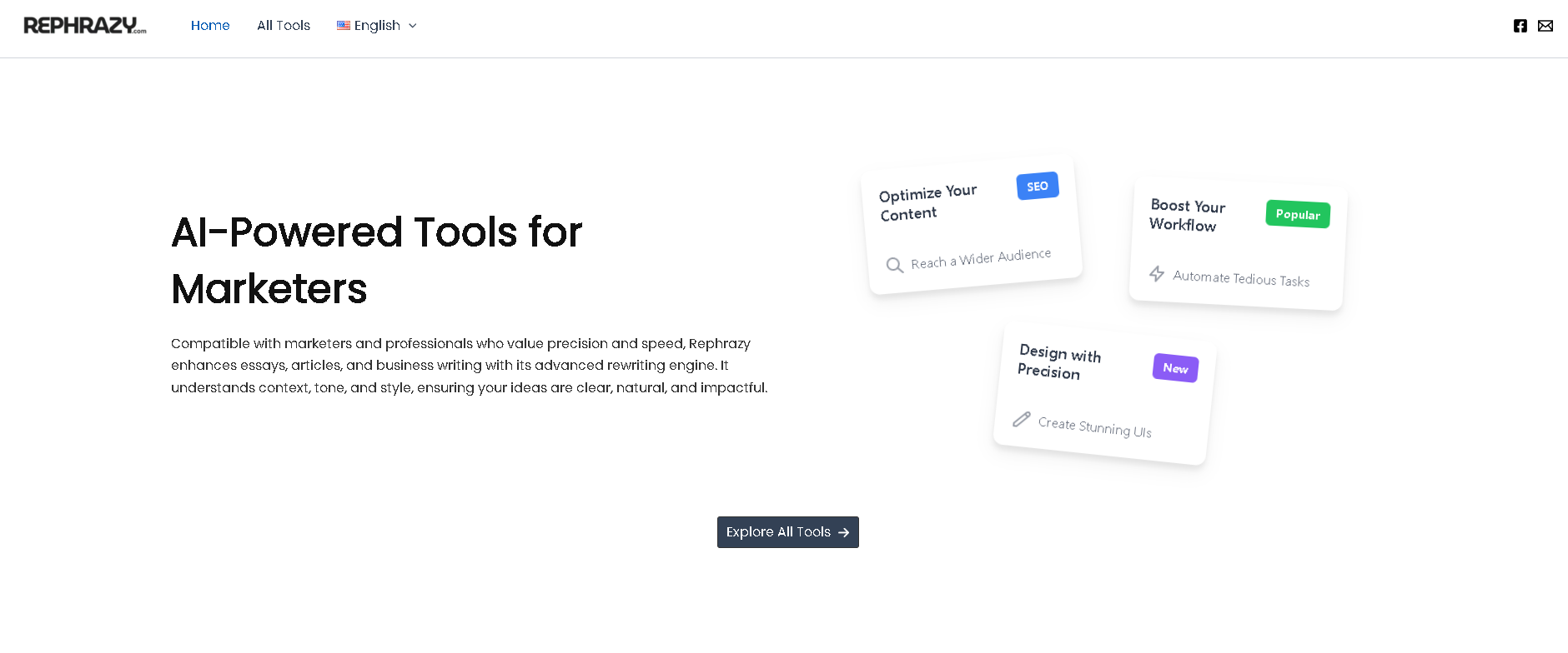 AI-Powered Tools for MarketersCompatible with marketers and professionals who value precision and speed, Rephrazy enhances essays, articles, and business writing with its advanced rewriting engine. It understands context, tone, and style, ensuring your ideas are clear, natural, and impactful. Optimize Your Content SEO Reach a Wider AudienceBoost Your Workflow Popular Automate Tedious TasksDesign with Precision New Create Stunning UIsExplore All ToolsMost Popular Professional ToolsBegin with our top-rated tools, trusted by thousands of professionals around the world.