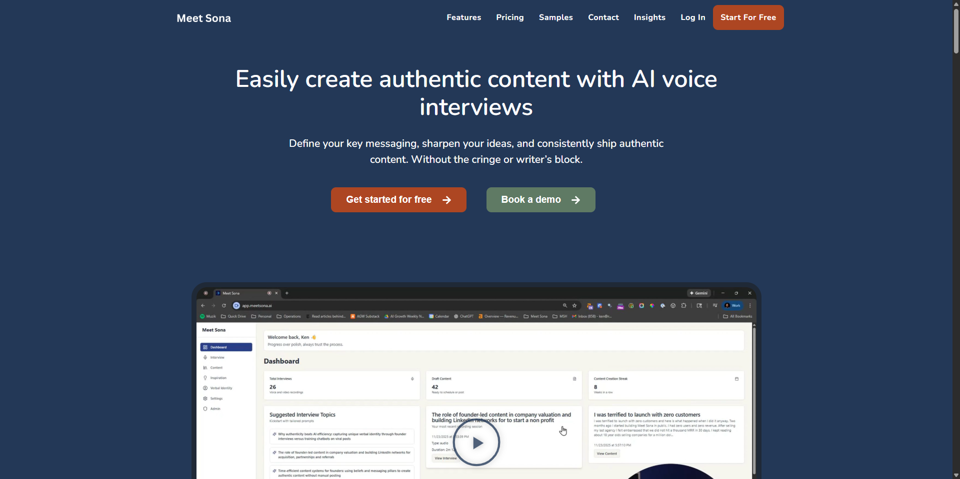 Meet Sona helps founders define what makes them special and turns conversational AI voice interviews into weeks of tasteful LinkedIn, newsletter, and blog content. Say goodbye to writer's block forever.