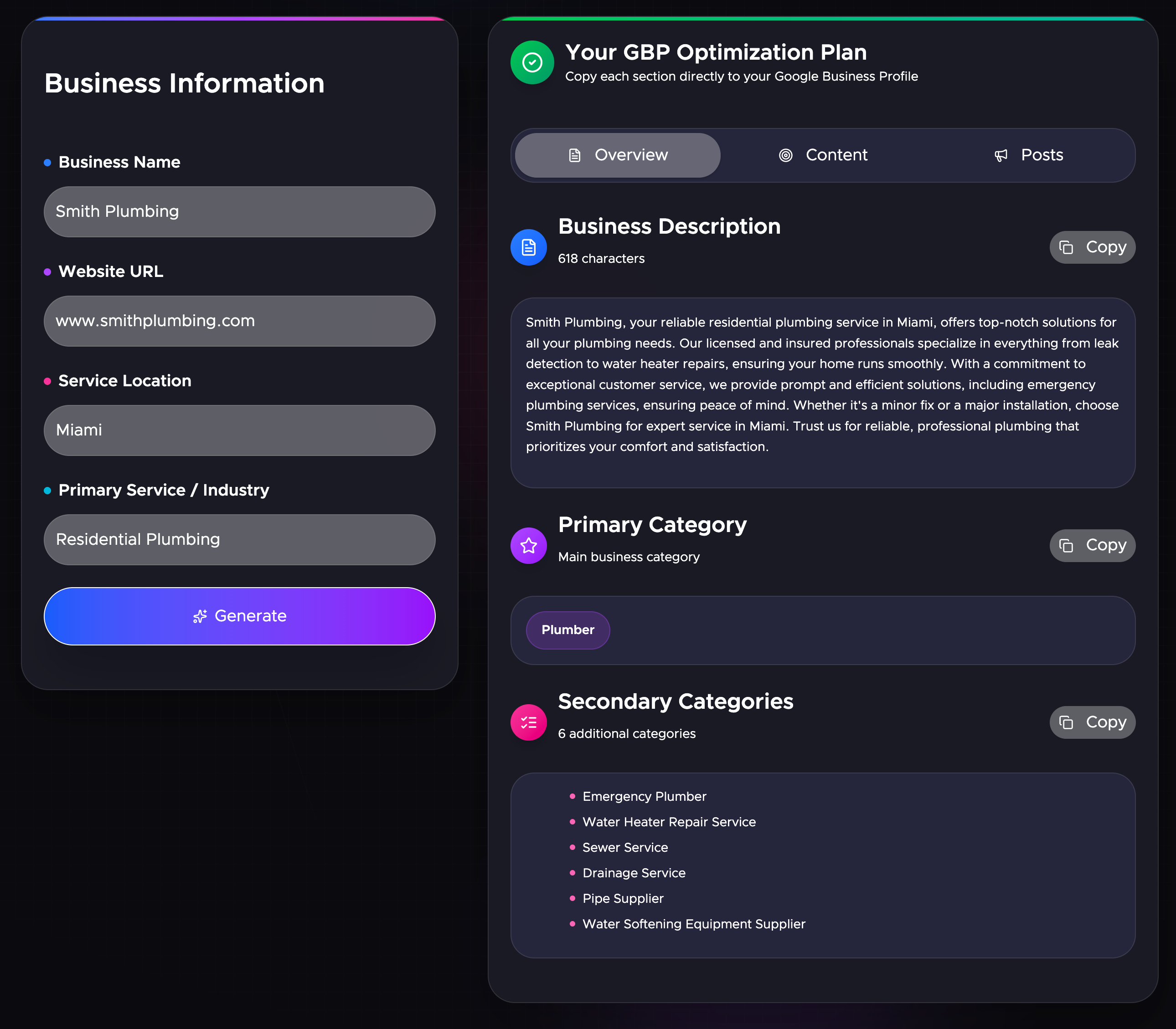 An incomplete Google Business Profile quietly kills visibility and trust. When key details are missing, descriptions are weak, questions are not answered and services are left out, Google cannot confidently recommend the business. The result is lower Map Pack rankings and fewer customers. GBP Optimizer fixes this in seconds by analyzing the business and creating a fully completed, SEO-optimized profile with the right description, categories, services, attributes, FAQ, and mock posts.