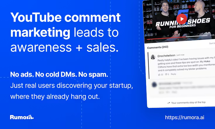 Rumora is the marketing tool - it uses real YouTube accounts to promote your business by commenting on relevant videos in your niche. Many marketers, especially in AI, use it to boost brand awareness and get sales much cheaper than running ads. I got thousands of sales and more Google searches from these comments. Rumora basically ensures your business is mentioned in the top viewed comments all over YouTube.