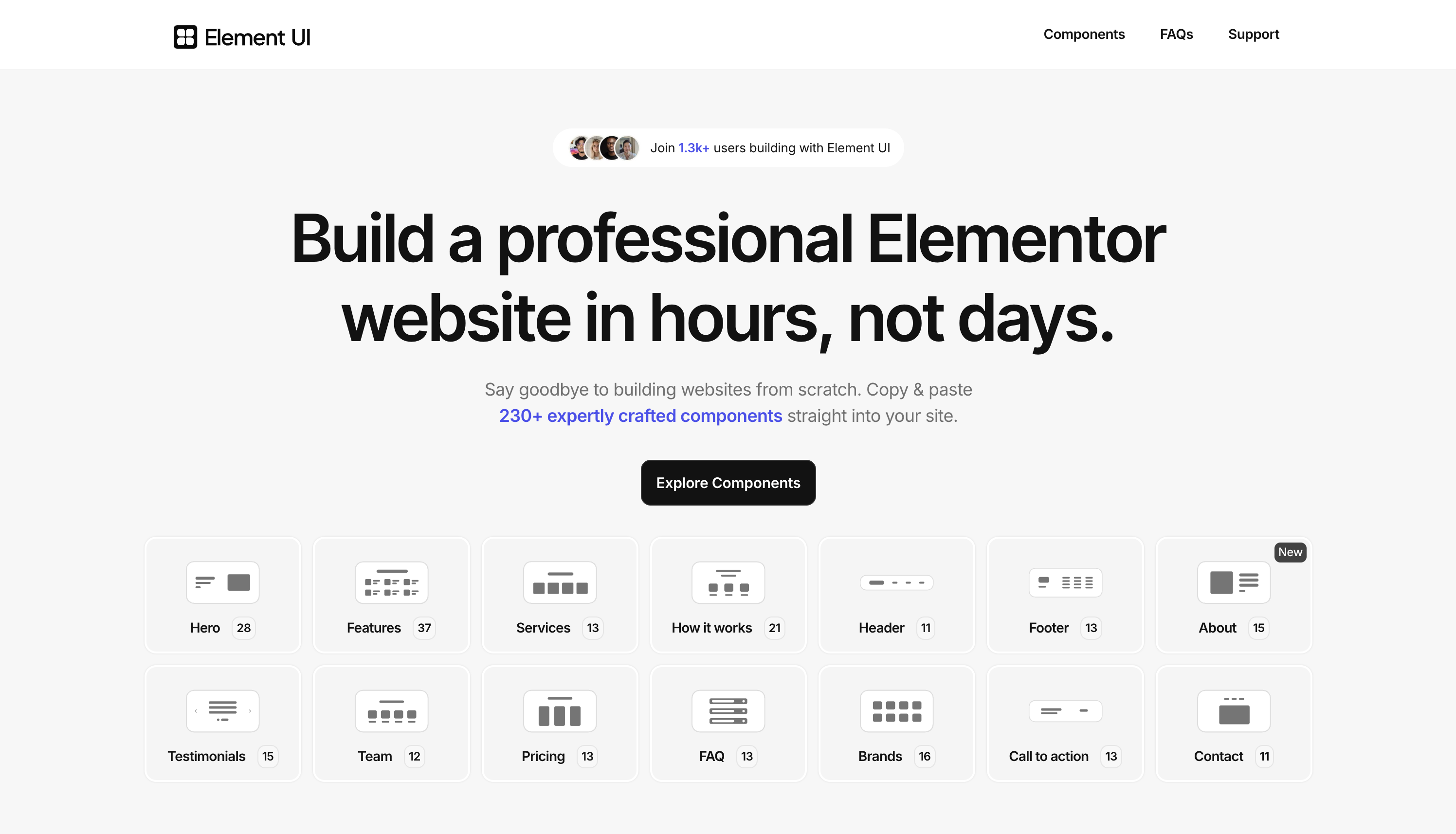 Element UI offers a library of 230+ expertly crafted components for building professional Elementor websites quickly and consistently. It eliminates the need to start from scratch, saving countless development hours. Regular updates and additions ensure fresh designs are always available. The toolkit is designed to work seamlessly, providing a polished, consistent look without needing design experience.